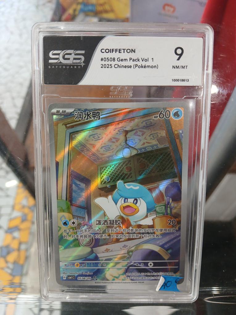 Issu de la collection spéciale Gem Pack Vol 1 (2025) en version chinoise, ce Coiffeton (Quaxly) est présenté dans une illustration magnifique qui occupe toute la carte. L’œuvre de l’artiste Souichirou Gunjima dépeint le Pokémon caneton dans un intérieur chaleureux et détaillé, transformant cette carte de jeu en une véritable pièce de collection artistique.