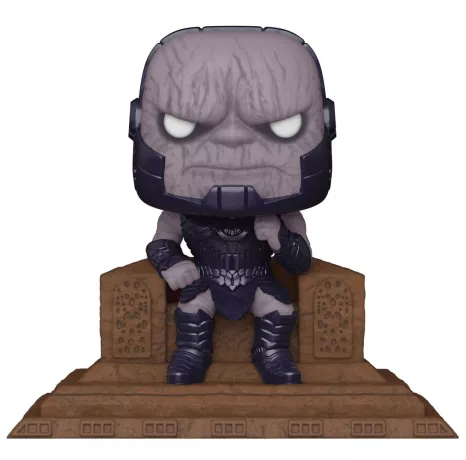 Darkseid est représenté assis sur son trône, incarnant toute sa puissance et son autorité. Le design POP! stylisé capture parfaitement son apparence imposante, son regard menaçant et son statut de souverain d’Apokolips.
