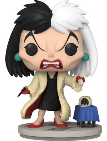 Cruella de Vil est représentée avec son apparence iconique : cheveux noirs et blancs, manteau élégant et attitude extravagante. Le design POP! stylisé capture parfaitement son style excentrique et son caractère impitoyable.