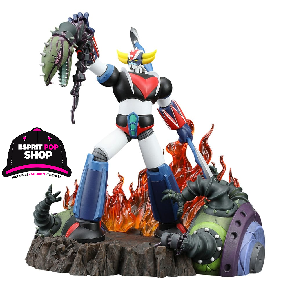 Grendizer est représenté dans une pose dynamique et triomphante, retranscrivant toute la puissance du robot piloté par Actarus. La sculpture met en avant des détails précis : armure métallique, lignes mécaniques fidèles et effets de mouvement qui renforcent l’impact visuel de la scène.