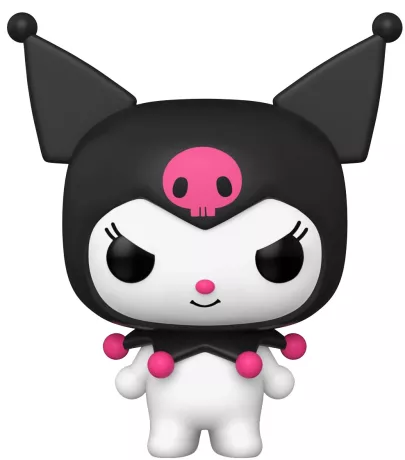 Kuromi est représentée avec son look iconique : bonnet noir orné d’un crâne rose, expression malicieuse et attitude espiègle. Le design POP! stylisé capture parfaitement son mélange unique de mignon et de rebelle.