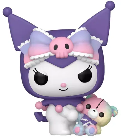 Kuromi est représentée tenant un petit ours en peluche, ajoutant une dimension douce à son look habituellement rebelle. Avec son bonnet noir orné du crâne rose et son sourire malicieux, le design POP! stylisé capture parfaitement le contraste qui fait tout son charme.