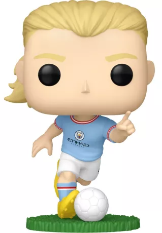 Erling Haaland est représenté avec son maillot officiel de Manchester City, dans une posture dynamique fidèle à son style de jeu. Le design POP! stylisé capture parfaitement son look reconnaissable et son statut de buteur d’élite.
